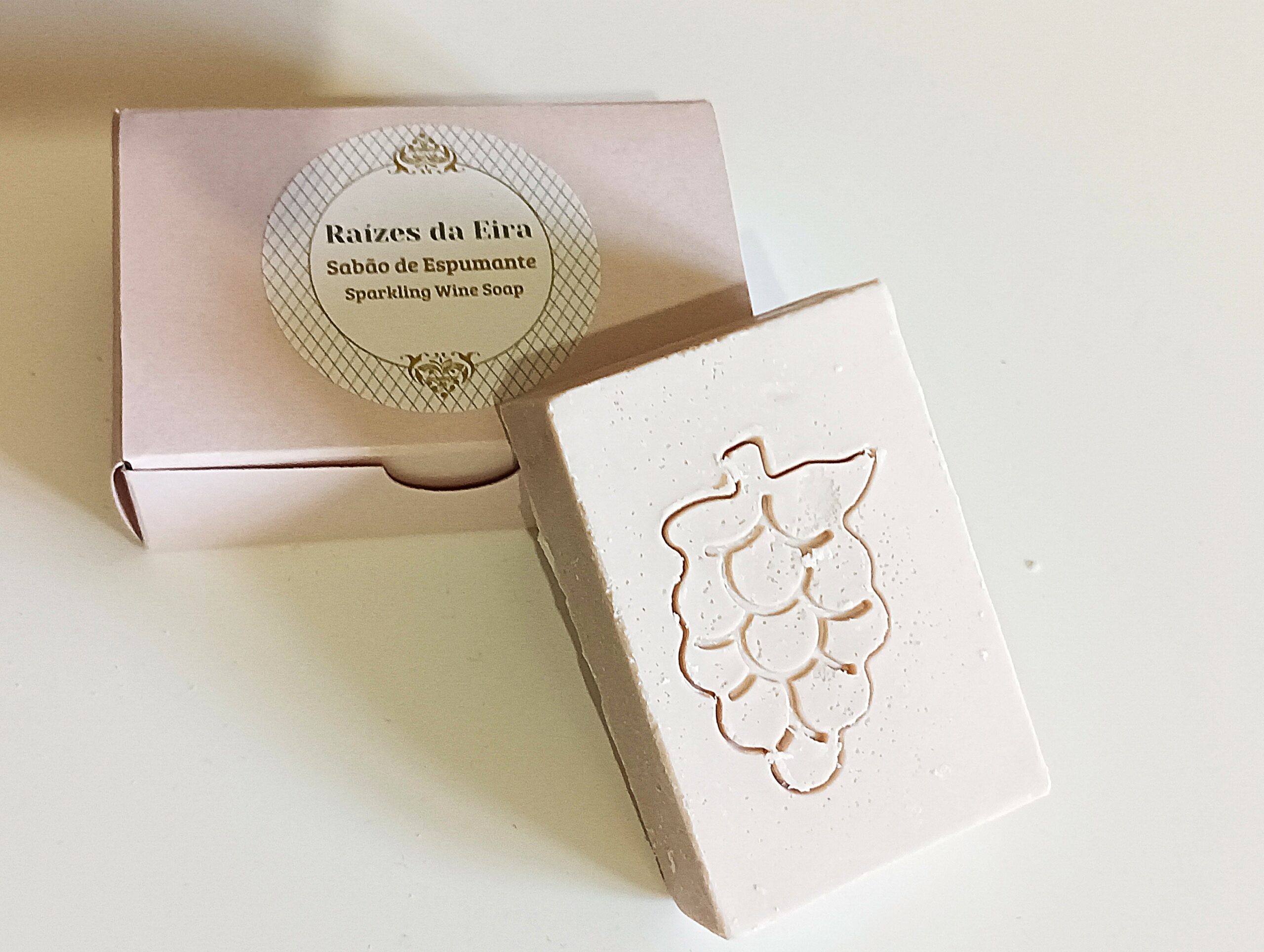 Sabonete à base de azeite extra virgem biológico da Beira Interior com o ingrediente principal vinho espumante complementado com mel e argila rosa e enriquecido com extrato de maçã e óleos essencias de rosas brancas, camomila e limonete.